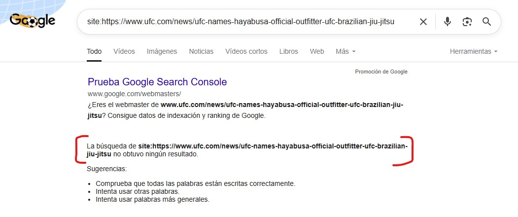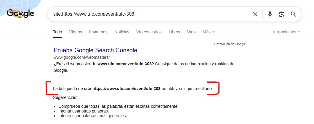 ¿El problema? Que si no tienes una web dada de alta en tu Search Console, pues no vas a poder analizar ahí sus URL’s. Y yo no tengo acceso a la propiedad del sitio de la UFC.