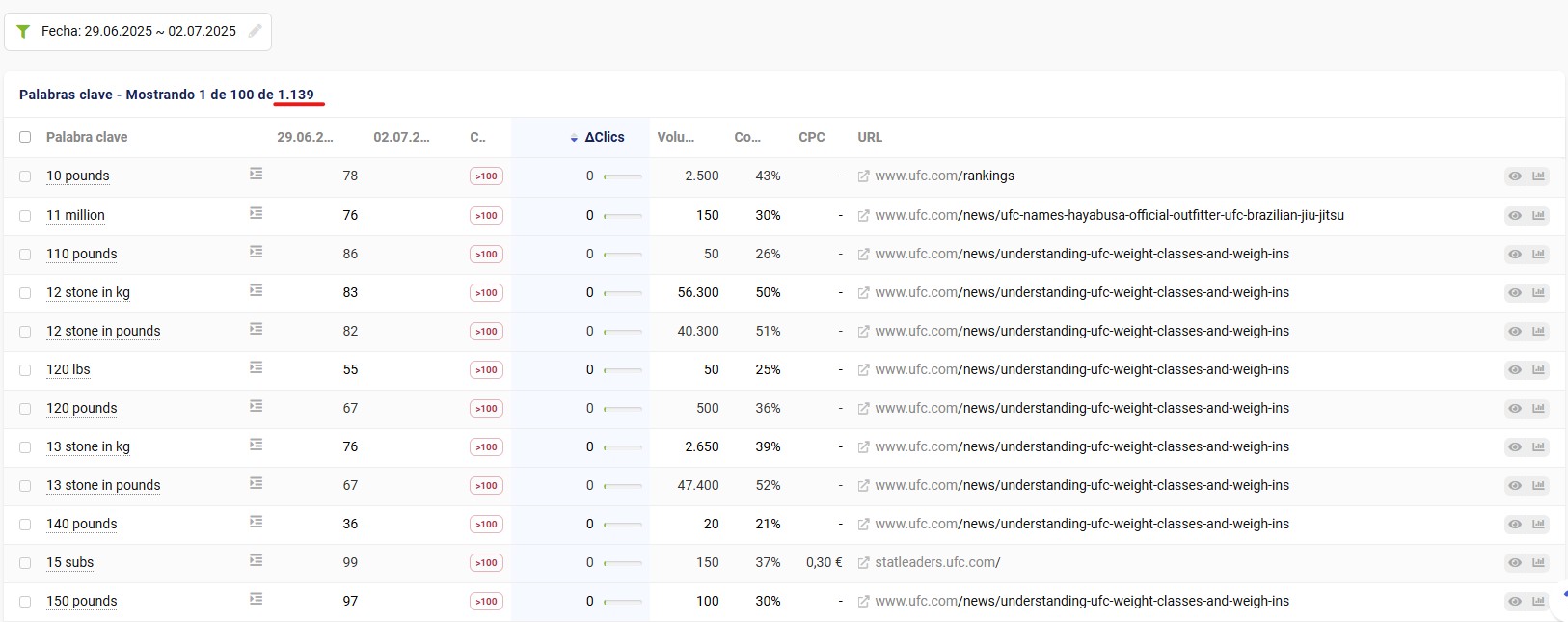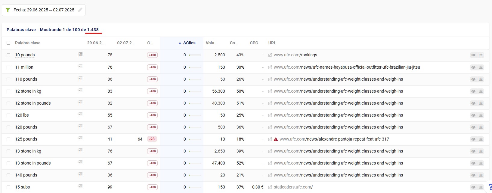 Bien, una vez sabemos qué ha caído, vamos a ver en qué páginas. Igual por ahí podemos sacar algo en claro: que la caída se concentre en unas pocas URL’s, o en una sola tipología como las fichas de jugadores o los artículos del blog… cualquier patrón que nos ayude a seguir tirando del hilo.