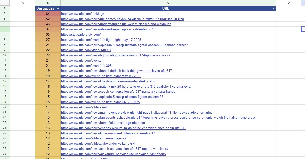 Exporto todo a un Google Sheets, listo las URL’s, cuento las palabras clave que tenía asociada cada una de ellas… en un par de fórmulas sencillas lo tenemos. Pero parece algo bastante generalizado, más de 400 páginas caen en mayor o menor medida y cada una de su padre y de su madre.