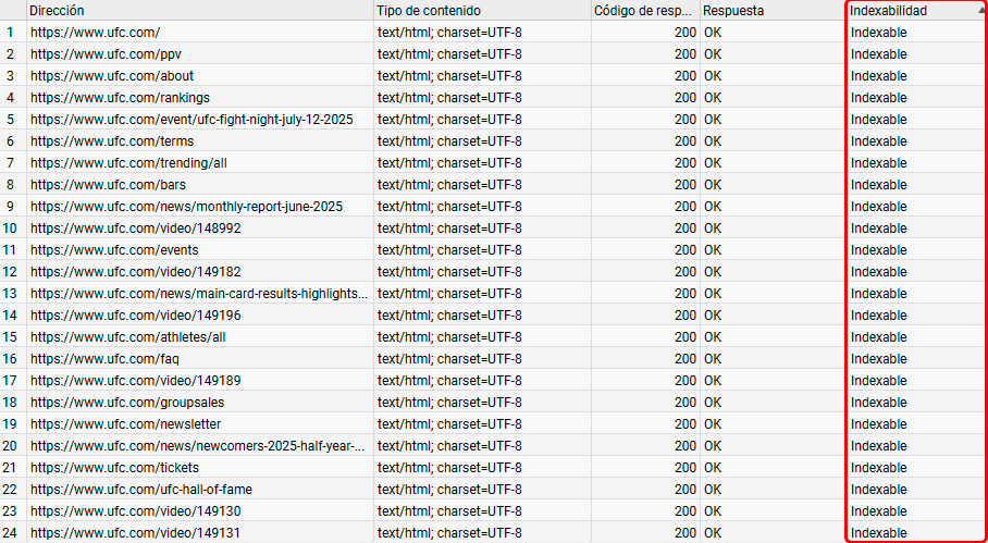 Nada, todo correcto por aquí también. He puesto un pantallazo de Screaming Frog para que veas que en general toda la web es perfectamente indexable, al menos las páginas que deberían serlo, pero es que si vamos a detalle a por ejemplo la que más palabras clave ha perdido nuevamente… cuenta con una indexabilidad envidiable.